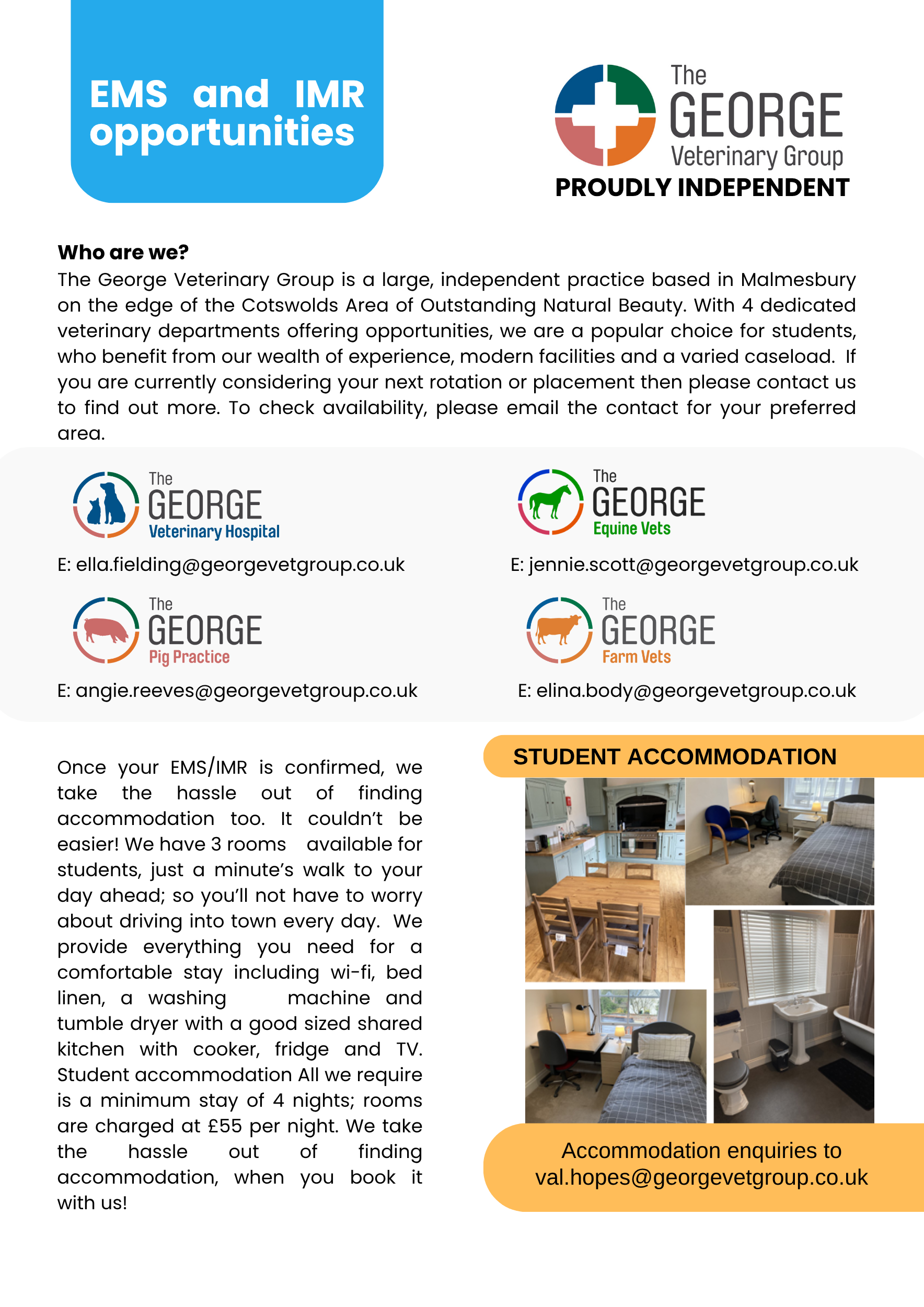 We take students in each of our four departments: equine, farm, pig and small animal. We hope that students seeing practice may be potential candidates for our new graduate programmes in the future. If you are interested in seeing practice through EMS at the George please fill in the application form below and email to the relevant contact indicated.