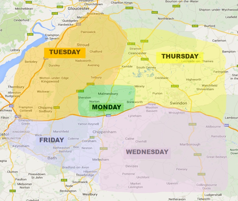 We offer a specified zone day, as indicated on the map, which is available to all our clients.